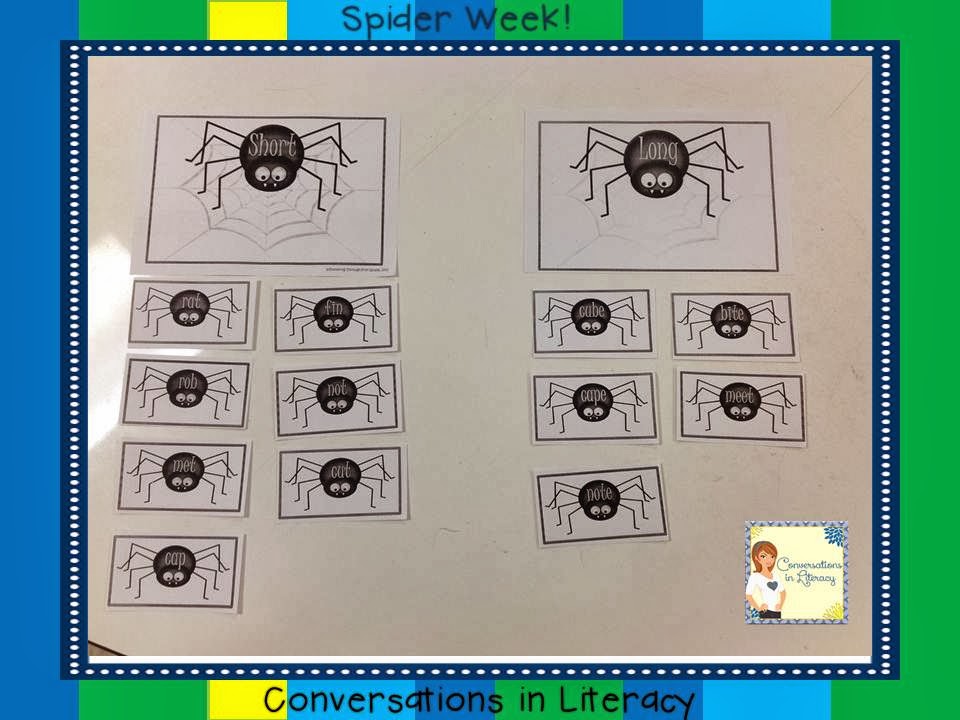 Older students did short vowel and long vowel word sorting.  It was a lot of fun to have all my groups learning about spiders this past week!  The materials were freebies on TpT and books from Reading A-Z.  Students loved having something spooky to learn about for Halloween week and I loved that everything coordinated and was differentiated for each group and what they could handle.